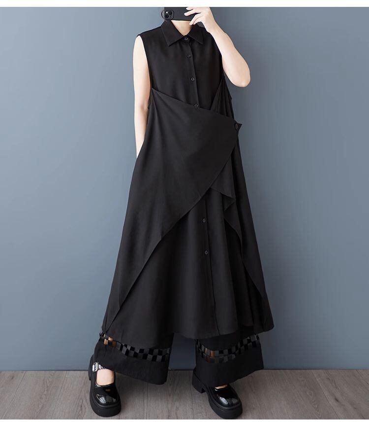 【EEOOOJP】モード系 大きいサイズ レディース 夏新作 ゆったり ステッチ カジュアルファッション 個性 シンプルデザイン ニッチ ノースリーブ シャツワンピース