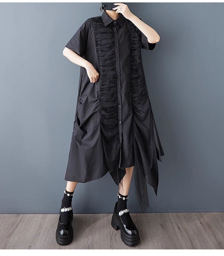 【EEOOOJP】モード系 プラスサイズ ゆったり 半袖シャツワンピース メッシュ 個性 つなぎ合わせ カジュアルファッション 不規則 シャツワンピース