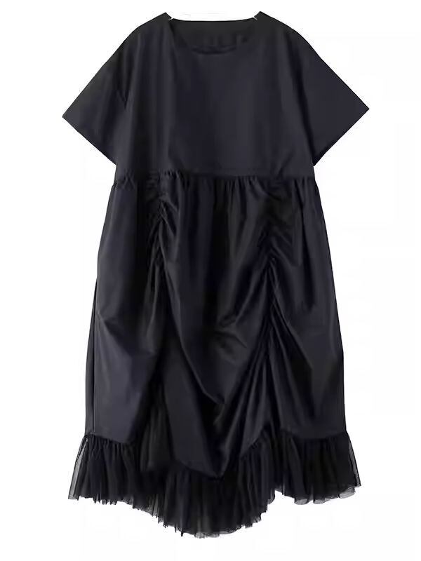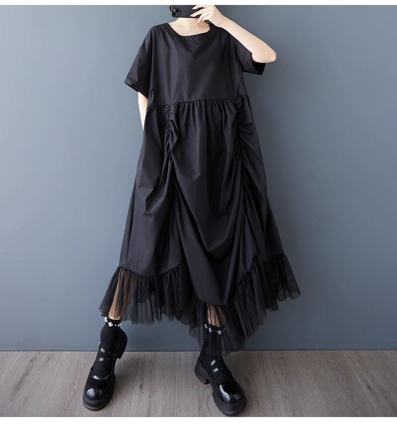 【EEOOOJP】モード系 ニッチなデザイン ドレス 夏 新作 ファッション プリーツ ルーズ スプライシング メッシュ 不規則 ロングスカート