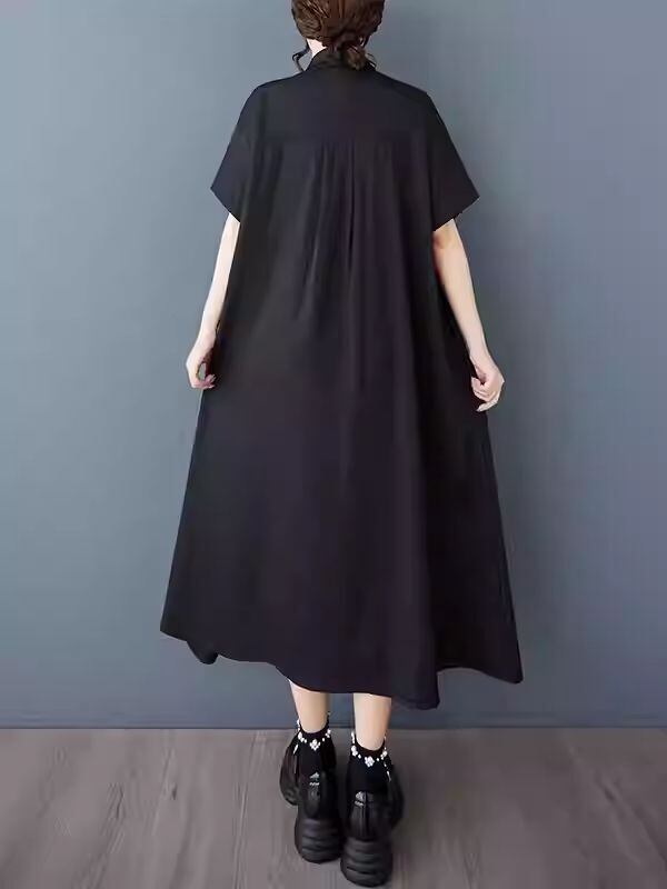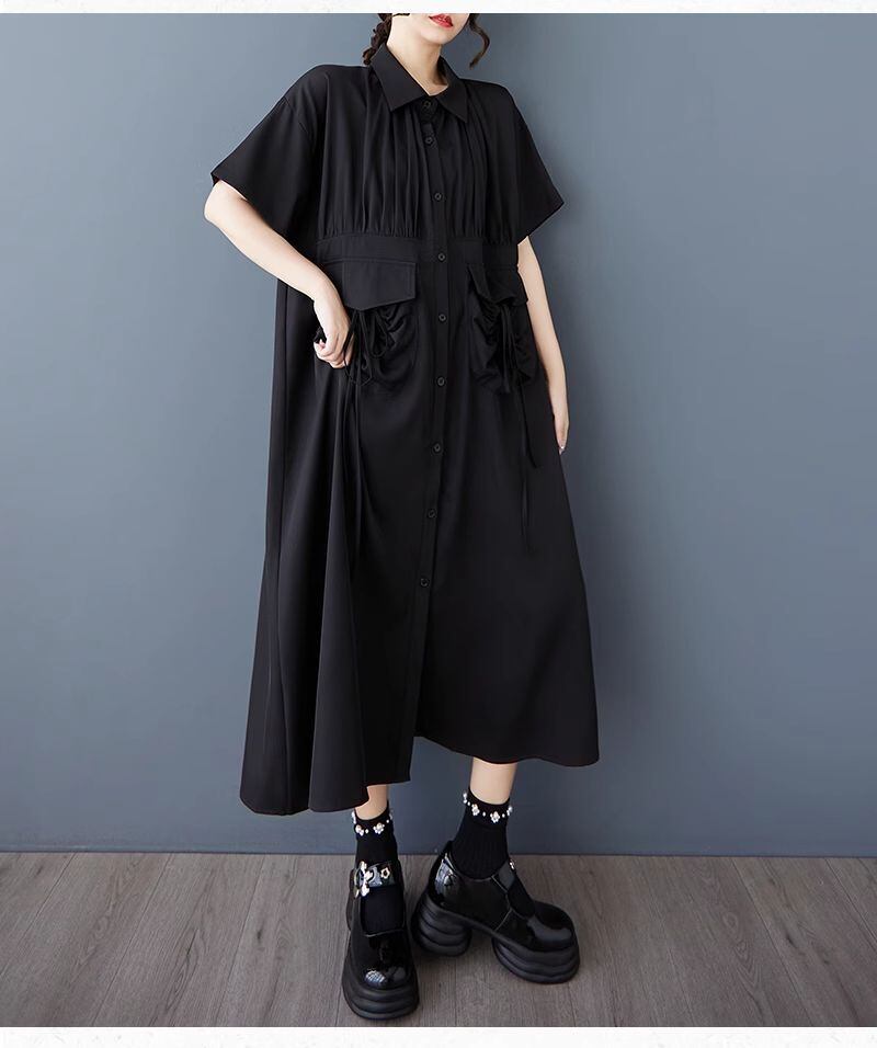 【EEOOOJP】モード系 女性用 ブラック プラスサイズ ドレス 夏新作 ゆったりスリム ビッグポケット ミディアム 個性派 ロングシャツスカート