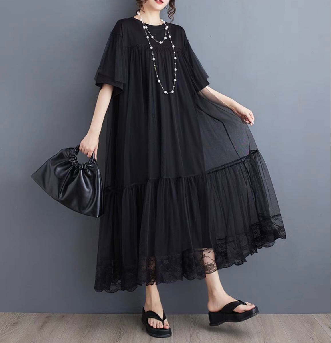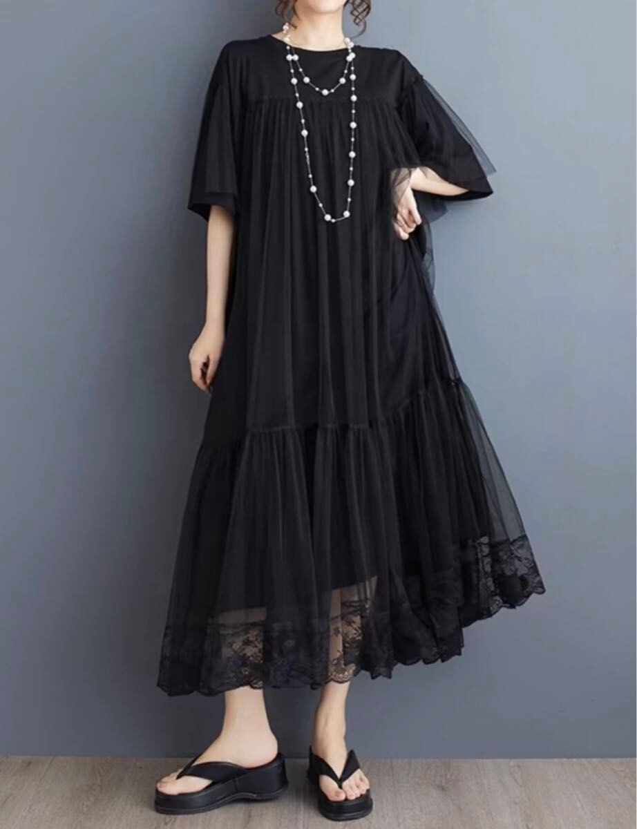 【EEOOOJP】モード系 メッシュ 舞うオール 個性 ドレス ブラックワンピース