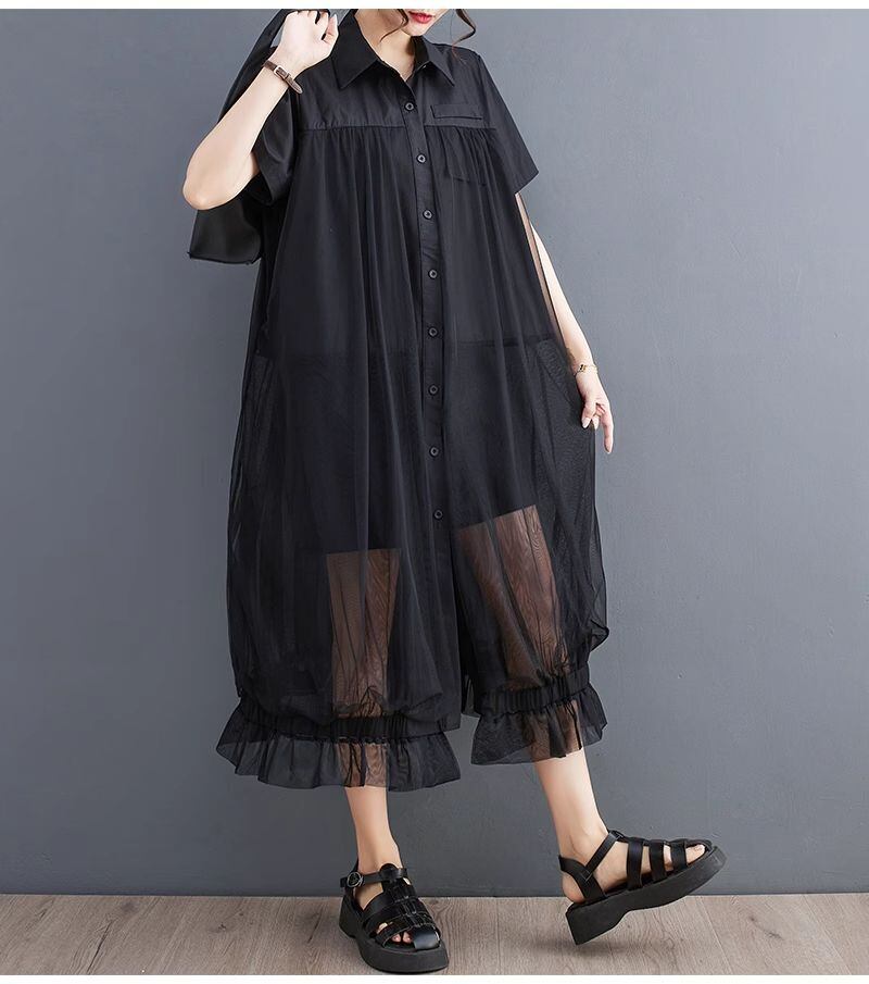【EEOOOJP】モード系 新作デザイン メッシュ スプライシング フェイクツーピース シャツワンピース 半袖ワンピース レディース ゆったり スリム ミドル丈ワンピース