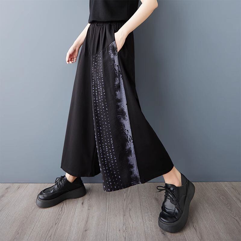 【EEOOOJP】モード系 デザインセンス ステッチ プリント ブラックワイドレッグパンツ レディース 夏 大きいサイズ スカートパンツ スリム オールマッチ