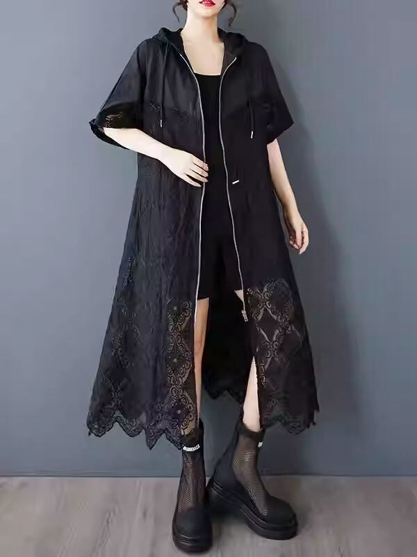 【EEOOOJP】モード系 大きいサイズ 新作 ゆったり ファッション 中空 フックフラワー スプライシング フード付き ミディアム ロング 気質ドレス