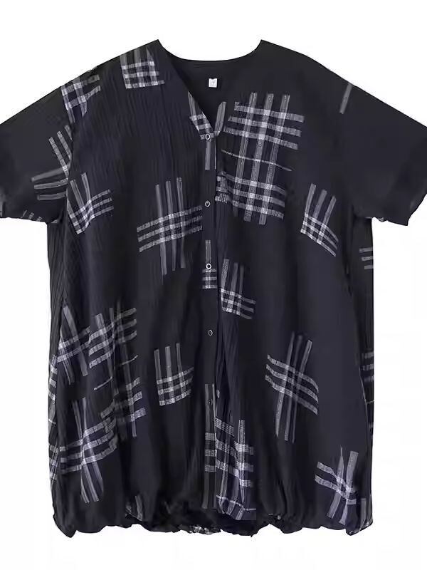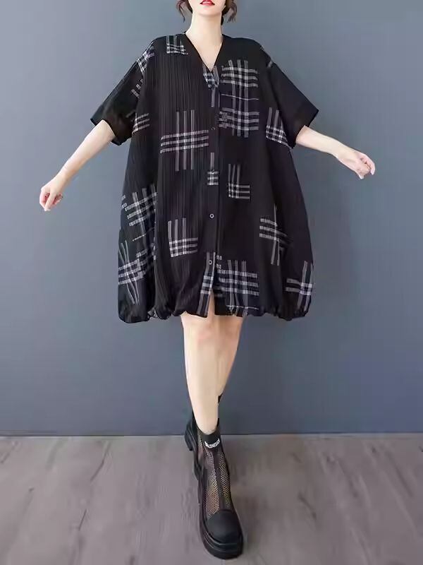 【EEOOOJP】モード系 ゆったりとした レトロ 文学的 Vネック 大きいサイズ チェック柄 ステッチ ファッションシャツ ワンピース