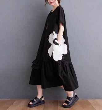 【EEOOOJP】モード系 ビッグフラワー ワンピース 半袖 切り替えワンピ フリルワンピ ロングワンピ 花柄ワンピ ゆったりワンピ オーバーサイズ モノトーン ミディ丈 プルオーバー ラウンドネック レディース ストリート系 モード系 個性的 原宿系
