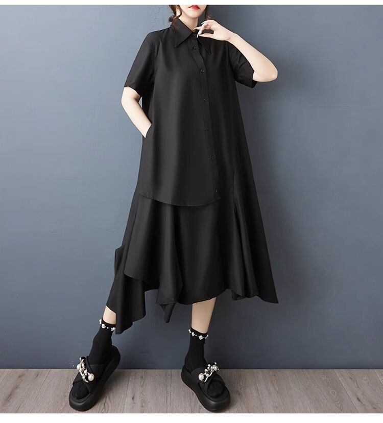 【EEOOOJP】モード系 韓国風 ゆったり 大きめサイズ スプライシング カジュアル シャツワンピース レディース 夏 シンプル 通勤 甘い 半袖ワンピース フリル 個性派