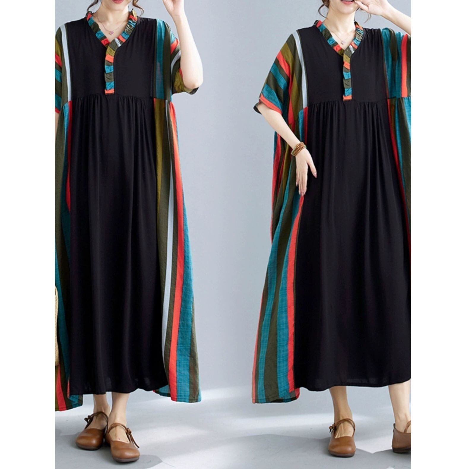 【EEOOOJP】モード系 マルチカラー 配色 ストライプステッチ Vネック ハーフスリーブ ワイドAライン 個性 夏物 半袖ワンピース シフォンワンピース ロングドレス