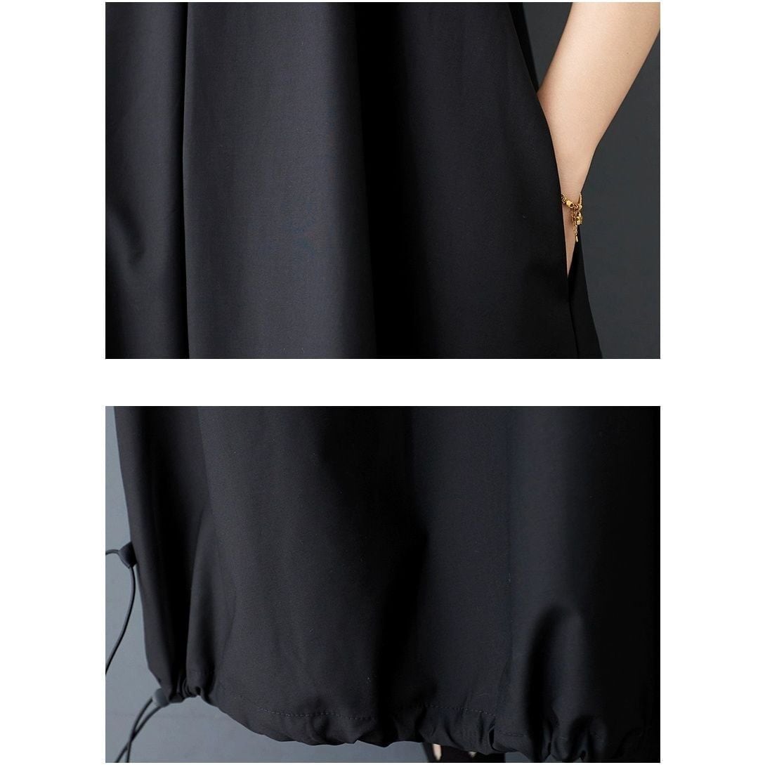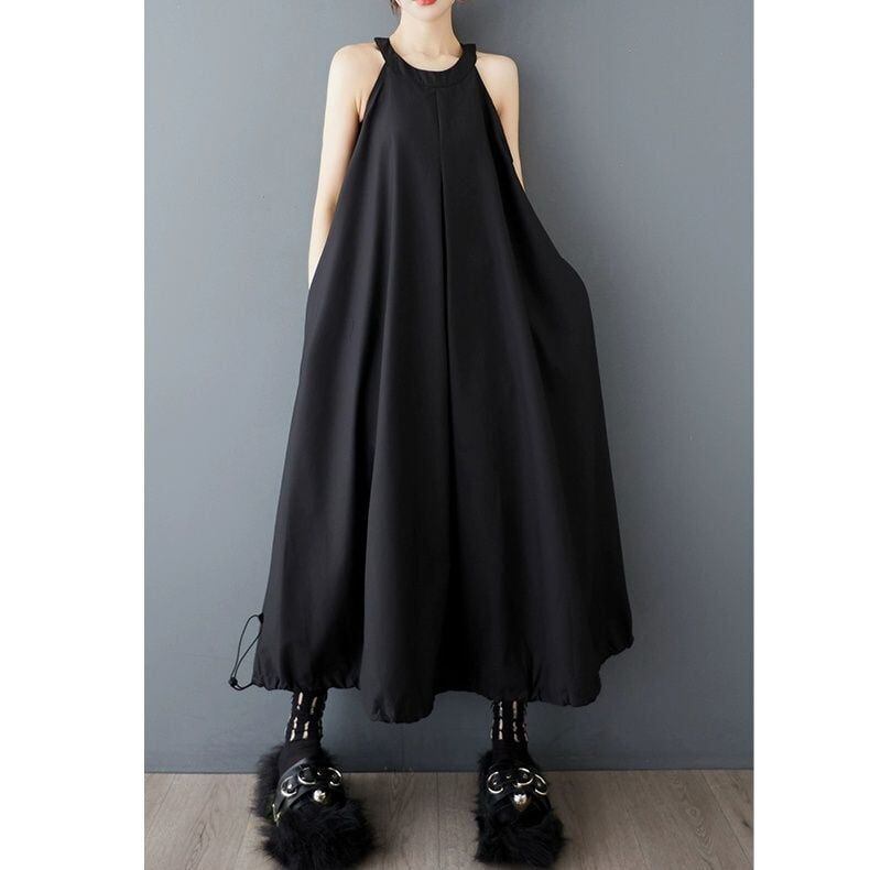 【EEOOOJP】モード系 クールな印象 ブラック ノースリーブ Aライン アレンジ ドローコードヘム ロングドレス 夏物 個性派 ロングドレス パーティドレス