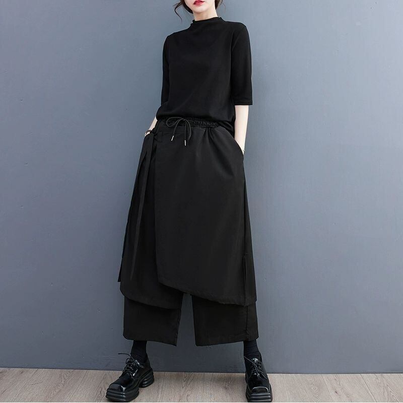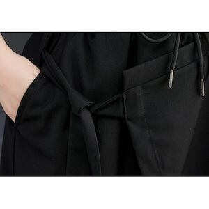 【EEOOOJP】モード系 ロングパンツ ブラック レイヤードデザイン ワイドレッグクロップドパンツ