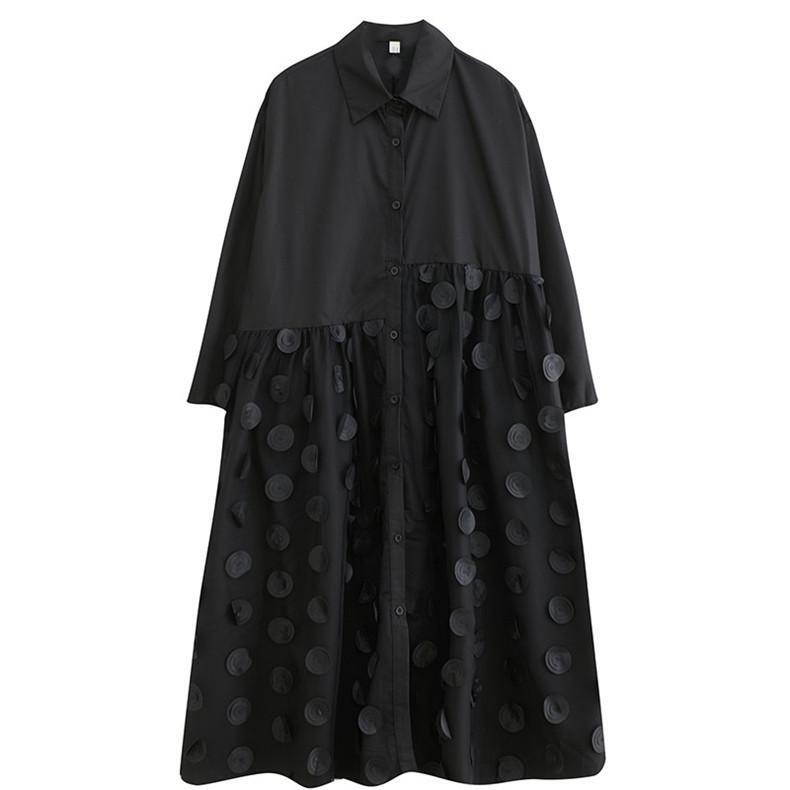 【EEOOOJP】ワンピース マキシワンピ ロング丈 無地 春秋 レディース フレア裾 ゆったりとしたシルエット 折襟 ビッグサイズ 自然に体型カバー
