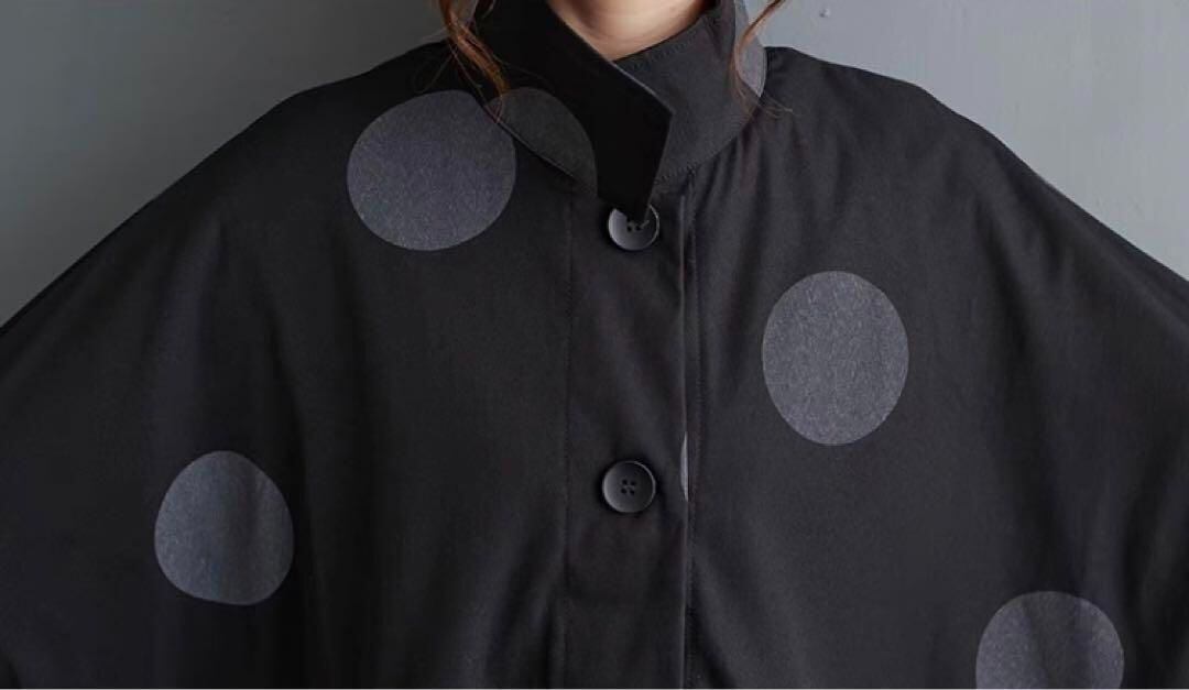 モード系にぴったりな洗練されたデザインのドルマンコートが登場しました。独特のドット柄が目を引く襟付きで、上品な印象を与えてくれます。膝丈の丈夫で暖かい生地を使用しており、寒い季節にも大活躍間違いなしのアイテムです。ブラックとカーキ、2色展開なので、自分のスタイルに合わせて選ぶことができます。