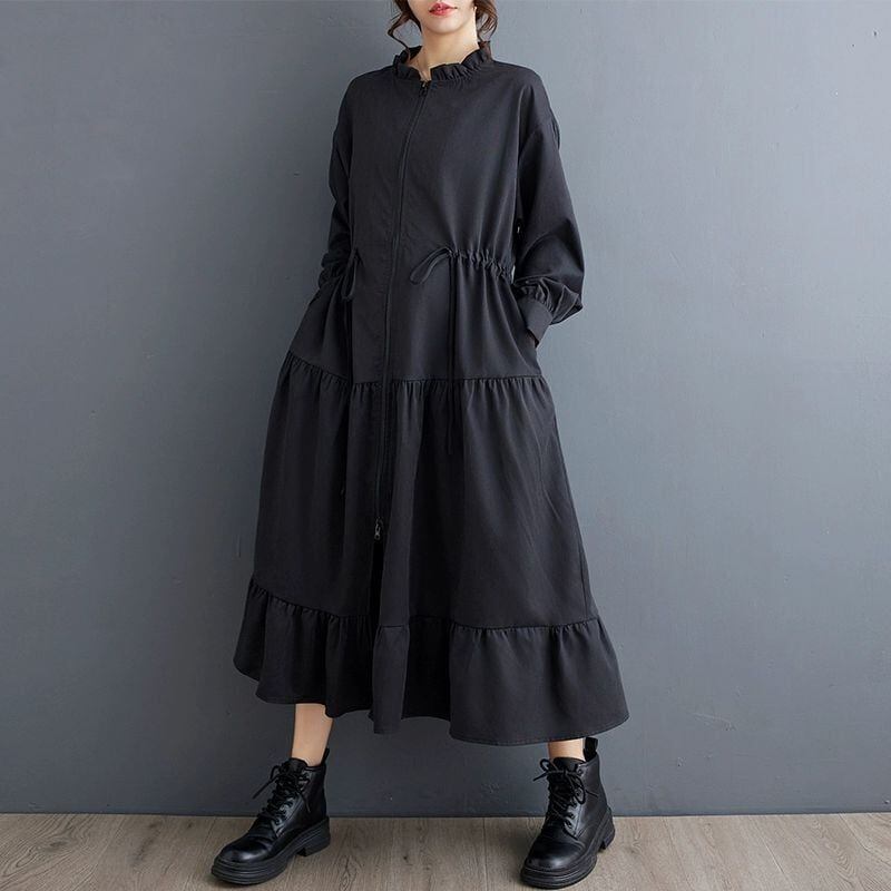 【EEOOOJP】モード系 ニューデザイン ブラック フリル スタンドカラー Aラインワンピース ミディ フルジップ シャツ ドレス コート