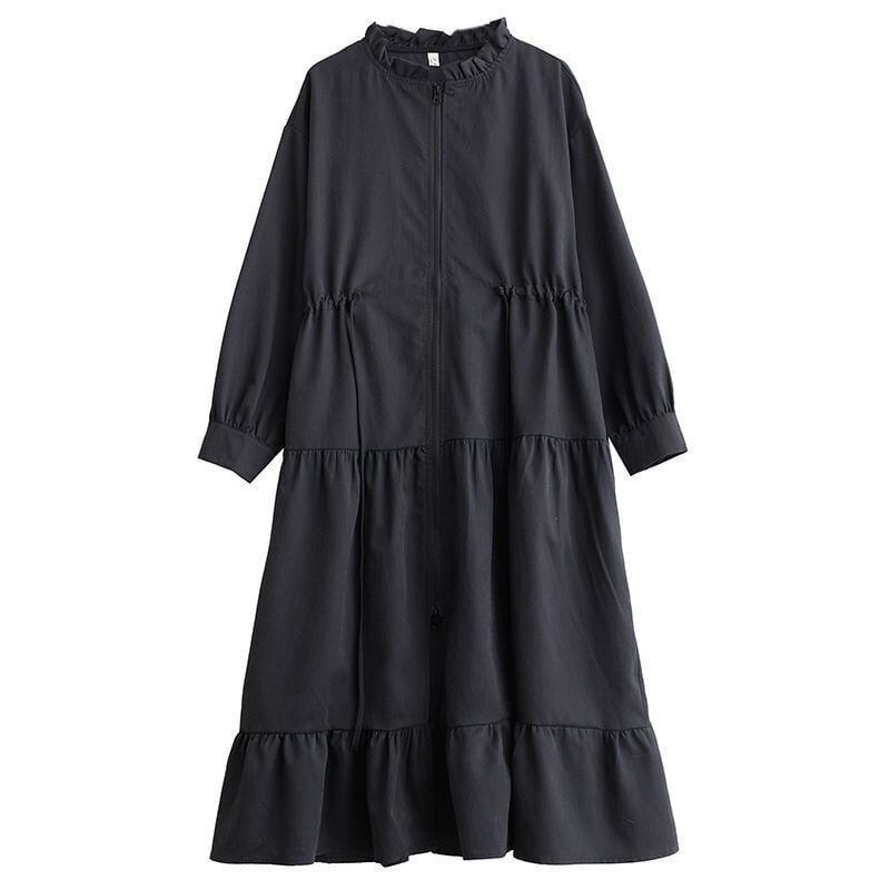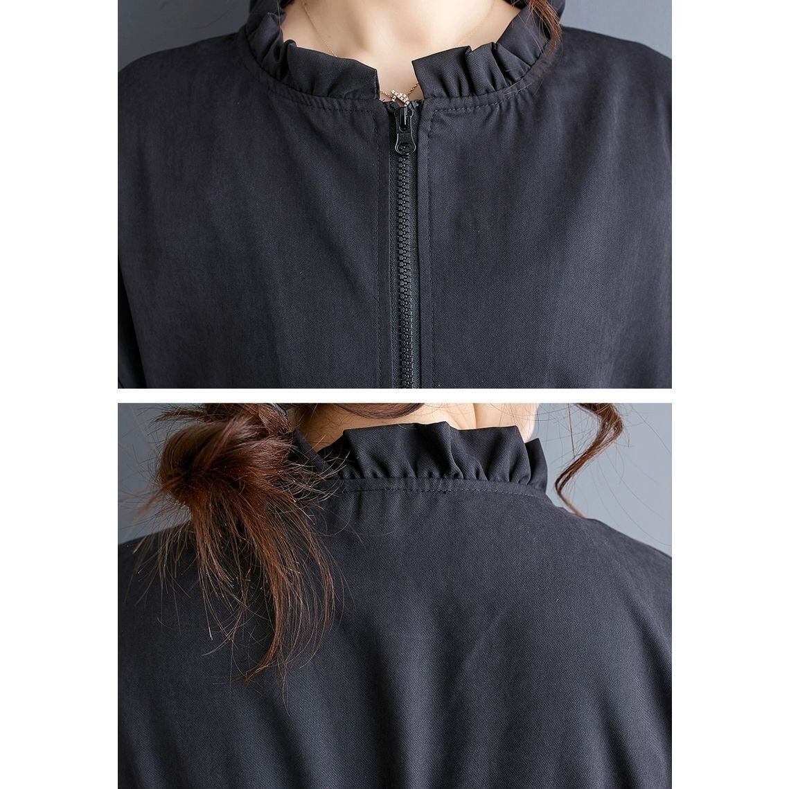 【EEOOOJP】モード系 ニューデザイン ブラック フリル スタンドカラー Aライン ミディ フルジップ シャツ ドレス ジャケット