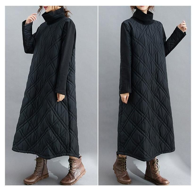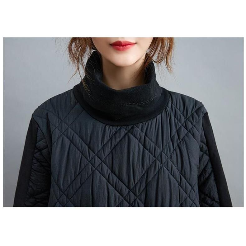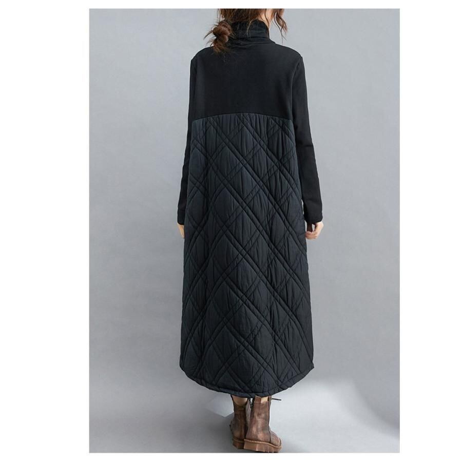 【EEOOOJP】モード系 キルティングワンピ レディース プルオーバー ロング丈 ハイネック さりげなく体型カバー 大きいサイズ あり 襟&袖 異素材 スッキリとした印象に