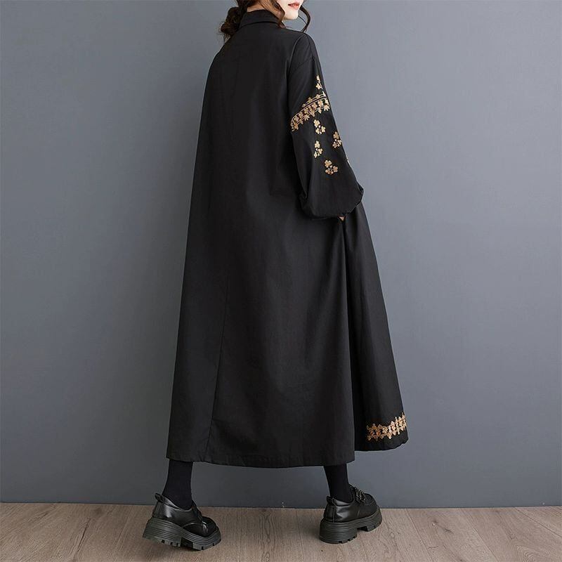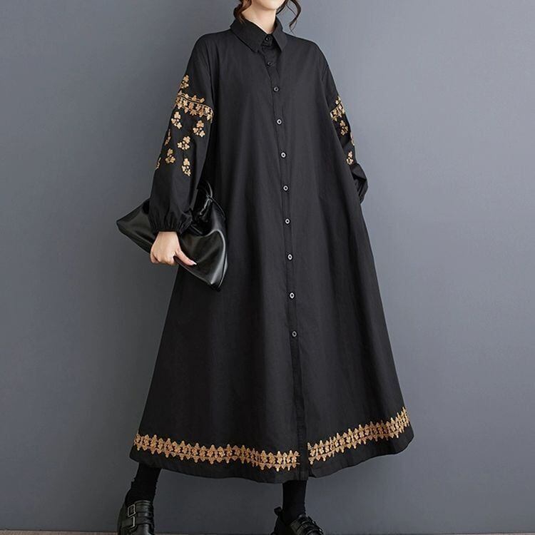 【EEOOOJP】モード系 刺繍入り ロングスリーブ Aラインミディシャツドレス シャツワンピース 秋物 長袖 個性派