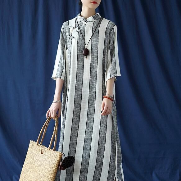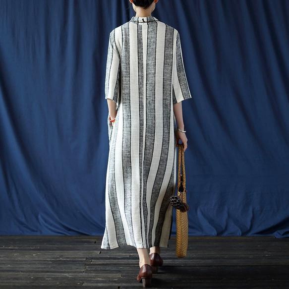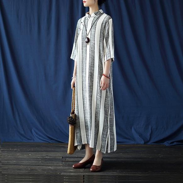 【EEOOOJP】綿麻 ハンドメイド 綿麻 ワンピース チャイナドレス 風 縞