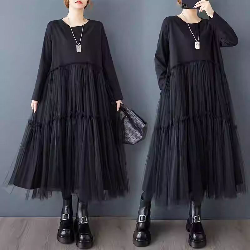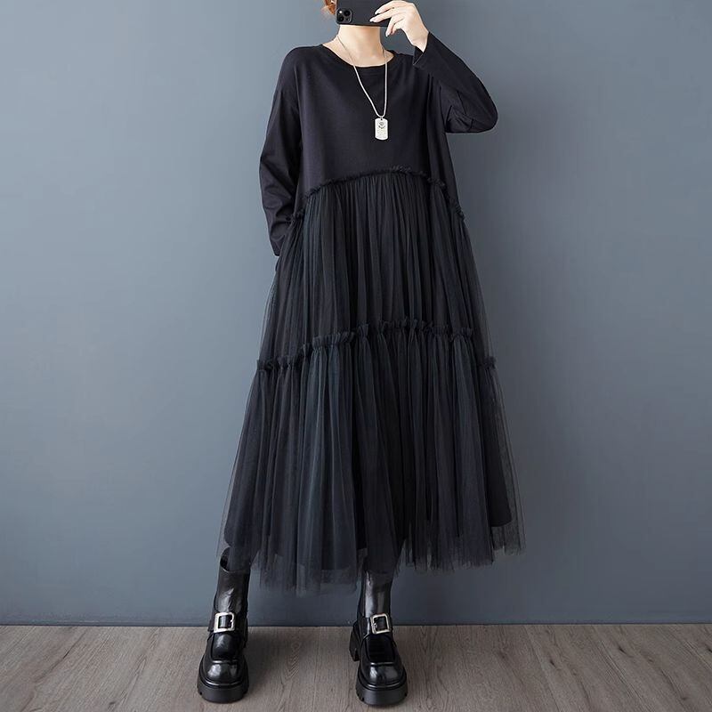 【EEOOOJP】モード系 ダーク メッシュ レディース 個性 スプライシング ドレス 春夏 プラスサイズ デザイン カジュアル 黒ロングスカート