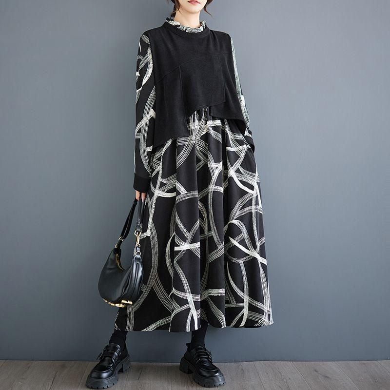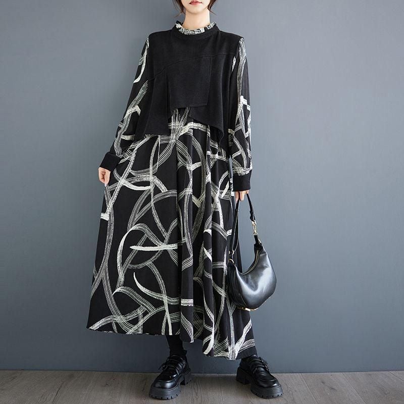 【EEOOOJP】モード系 切り替えワンピース 個性派 プリント 個性的なデザイン カジュアル 長袖ドレス フェイクインナー