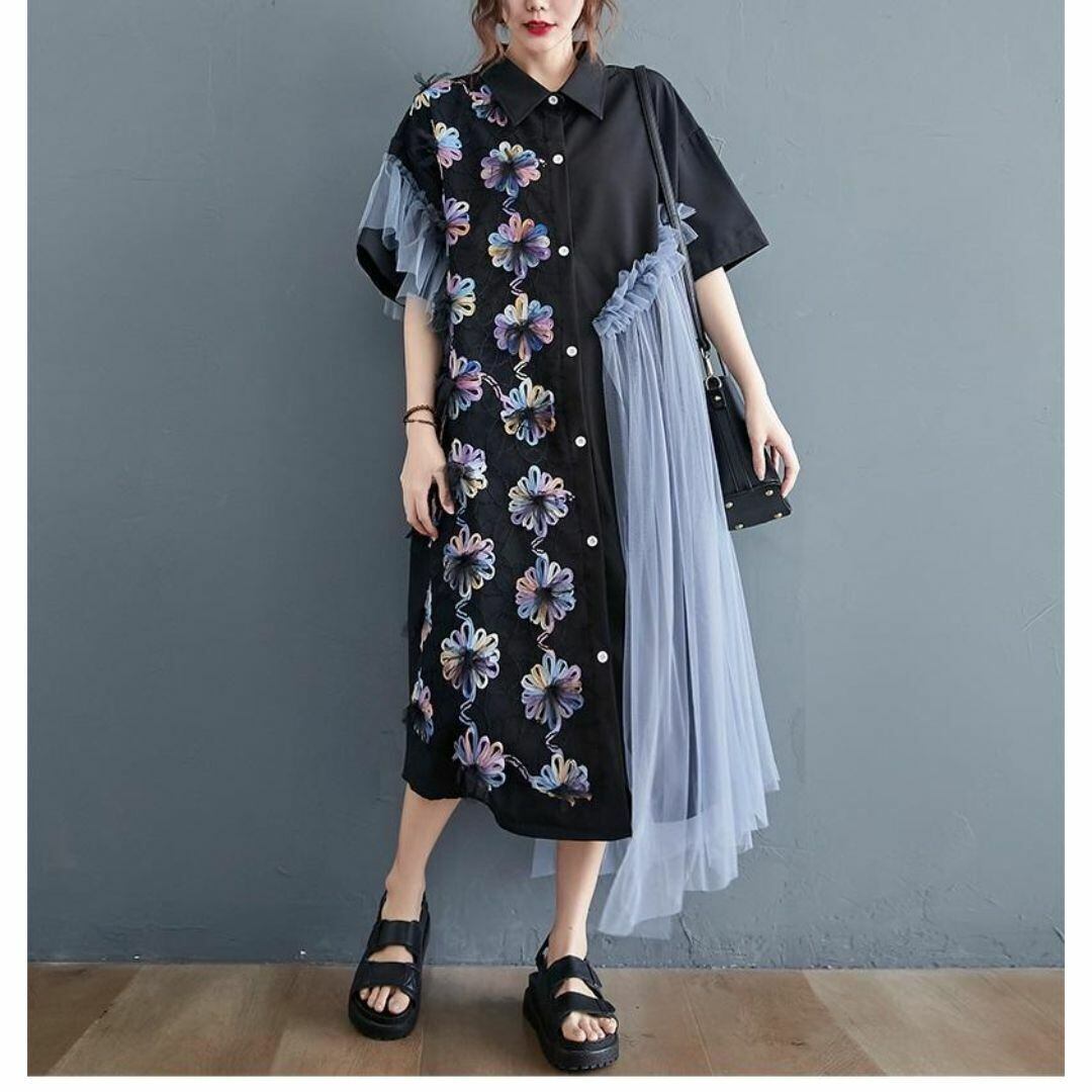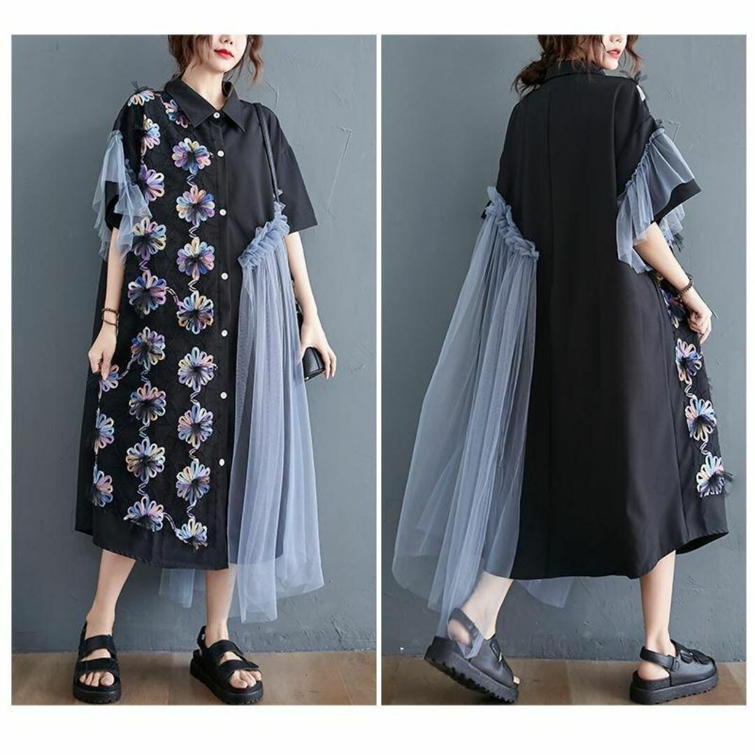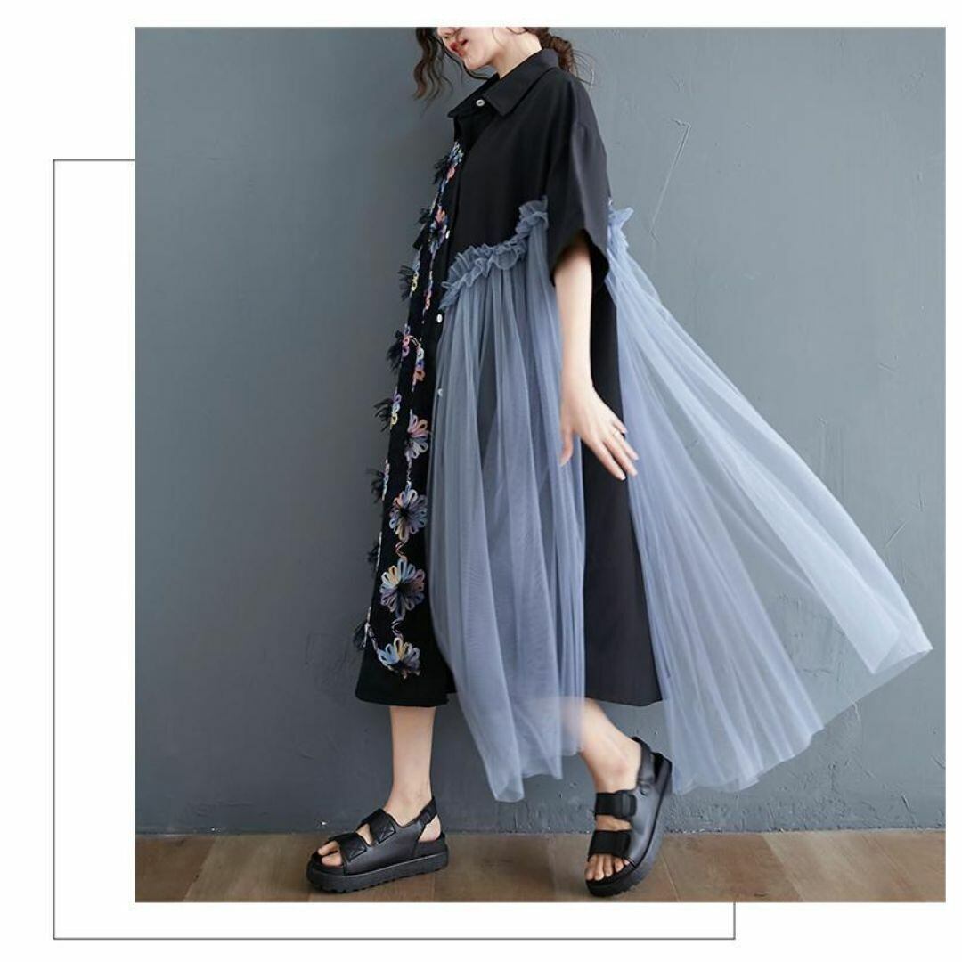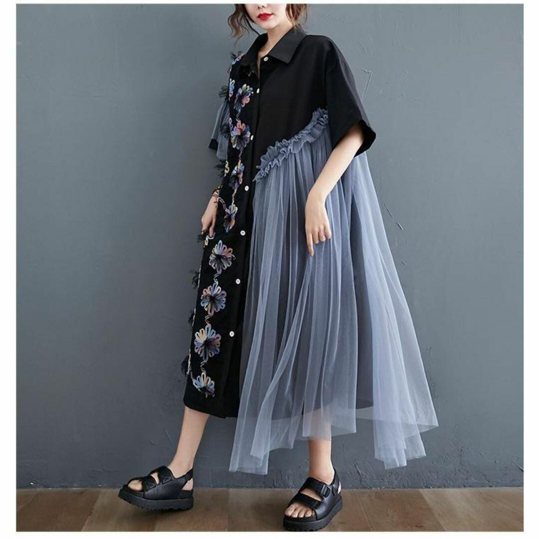 【EEOOOJP】モード系 大きいサイズ レディース ワンピース 舞台衣装 半袖シャツワンピース イベント衣装 春夏 新品 半袖 花柄 メッシュスカート チュール アシメ