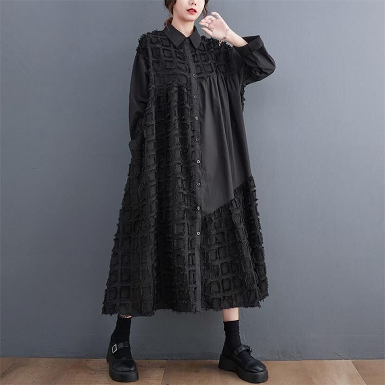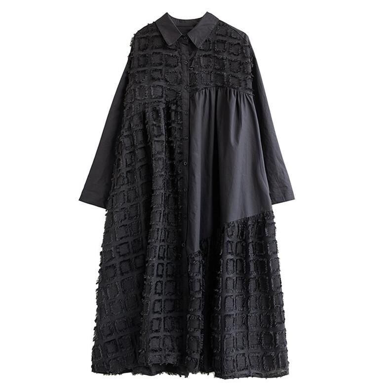 【EEOOOJP】モード系 シャツワンピース 長袖 個性派 ロング丈 切り替え 前開き ニューデザイン レディース 前ボタン留め 折り襟 ゆったりシルエット